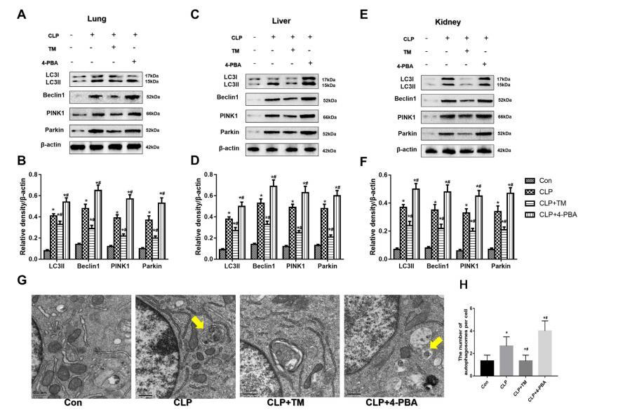 之前的研究結果表明,敗血癥會刺激ERS和自噬的發生和發展。在此,為了研究ERS對膿毒癥小鼠肺、肝和腎組織中自噬途徑活性的影響,小鼠在CLP手術前接受了4-PBA和TM治療。從數據中,我們發現CLP引發了肺、肝和腎組織中自噬蛋白LC3II、Beclin1、PINK1和Parkin增加(圖4A、B、C、D、E和F)。TM,ERS誘導劑抑制LC3II、Beclin1、PINK1和Parkin與CLP組的比較(圖4),而ERS抑制劑4-PBA逆轉了TM對化膿癥中LC3II、Beclin1、PINK1和Parkin的表達增加小鼠(圖4A,B,C,D,E和F)。與這些結果一致,我們還利用TEM觀察了雙膜自噬體的形成和自噬體空泡的數量。中電誘導的敗血癥誘導了自噬活性并增加了自噬體的數量(圖G和H)。與CLP組相比,當4-PBA進一步增加自噬體數量時,TM抑制了CLP操作誘導的自噬體數量(圖4G和H)。基于這些發現,ERS增加了敗血癥誘導的自噬活性。