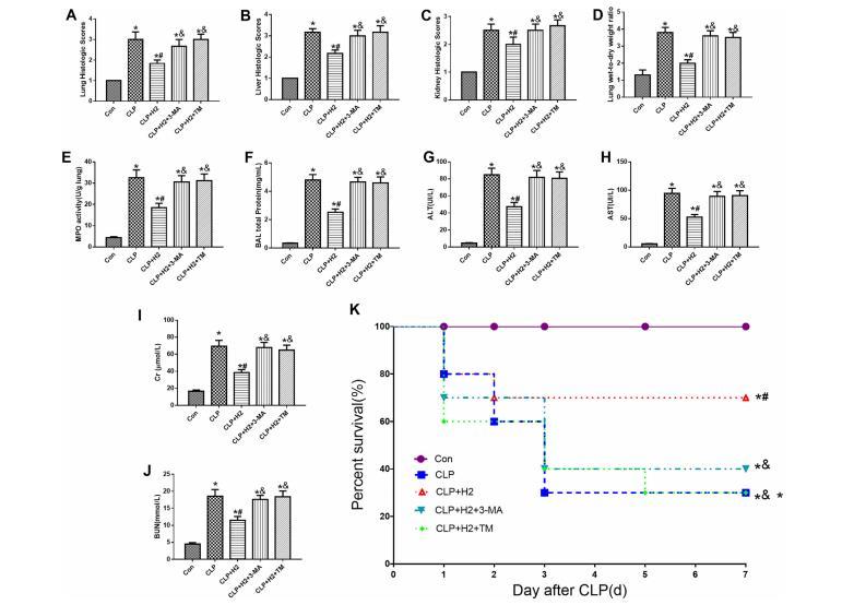 氫氣可防止敗血癥中的器官功能障礙和損傷。與CLP組相比,氫氣顯著改善了敗血癥的肺、肝和腎組織損傷、BLA總蛋白、MPO活性、肺W/D重量、血清AST、ALT、Cr和BUN以及存活率(圖10)。與CLP+H2組相比,3-MA或ERS誘導(dǎo)劑TM對自噬的抑制部分逆轉(zhuǎn)了氫氣對CLP+H2+3-MA組和CLP+H2+TM組上述指標(biāo)的保護(hù)作用(圖10)。這些結(jié)果表明,在膿毒癥中,氫氣通過激活自噬和ERS途徑失活,促進(jìn)對器官損傷和器官功能障礙的保護(hù),并提高存活率。