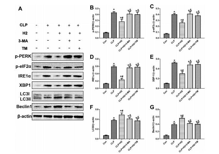 圖8:氫氣通過ERS和自噬的交叉作用調(diào)控膿毒癥小鼠肺中ERS和自噬相關(guān)蛋白的表達(dá)。給小鼠腹腔注射ERS誘導(dǎo)劑TM和自噬抑制劑3-MA后,在CLP12小時后收集肺樣本,通過Western印跡檢測ERS相關(guān)蛋白p-PERK(A和B)和p-eIF2α(A和C)、IRE1α(A和D)和XBP1(A和E)的表達(dá),以及自噬相關(guān)蛋白LC3(A和F)和Beclin1(A和G)的表達(dá)。