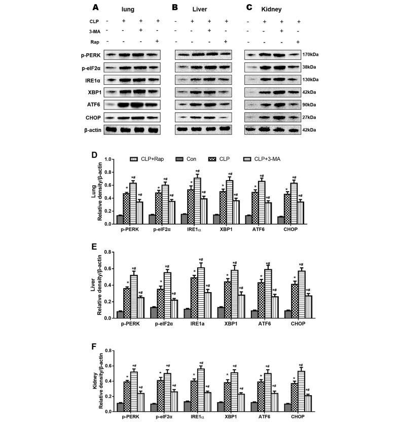以前的文獻(xiàn)表明,ERS調(diào)節(jié)自噬途徑的激活。但自噬是否能調(diào)節(jié)膿毒癥中ERS的活性呢?為了回答這個問題,我們分別給予Rap和3-MA(一種誘導(dǎo)劑和抑制劑),并測量了CLP小鼠肺、肝和腎組織中的ERS蛋白水平。結(jié)果表明,與CLP組相比,3-MA加劇了CLP+3-MA組小鼠肺(圖7A和D)、肝(圖7B和E)和腎組織(圖7C和F)中p-PERK和peIF2α、CHOP、ATF4、IRE1α和XBP1表達(dá)的增加(圖7)。然而,與CLP組相比,自噬誘導(dǎo)劑Rap可抑制CLP操作誘導(dǎo)的這些指標(biāo)的增加(圖7)。總之,這些結(jié)果表明,自噬活性的增加可減輕敗血癥的ERS。