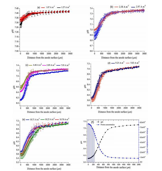 圖2.在電流密度為1.07A m-2和1.27A m 2時Geobacter生物膜內的平均pH分布,邊界層和批量溶液(a);在2.58 A m 2和2.97 A m 2時(b);在4.46 A m 2,5.89 A m 2和7.93A m 2時(c);在9.25 A m 2和9.83 A m 2時(d);在10.71A m 2,10.23 A m 2和10.70A m 2時。誤差線表示標準偏差。圖2(f)是在7.93A m 2下測量的剖面之一,以及Geobacter生物膜內上方和內部的質子濃度剖面。