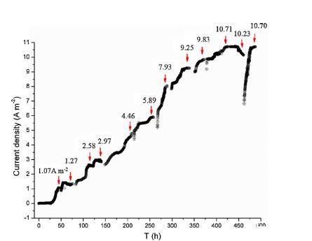 圖1.在恒定施加電位(-0.1 V vs.Ag/AgCl)下的Geobacter生物膜生長情況。紅色箭頭表示用于pH和CV測量的各種電流密度(它們分別為1.07A m 2,1.27A m 2,2.58 A m 2,2.97A m 2,4.46 A m 2,5.89 A m 2,7.93 A m 2,9.25 A m 2,9.83 A m 2,10.71A m 2,10.23 A m 2和10.70A m 2,分別為45小時,72小時,116小時,140小時,205小時,256小時,285小時,330小時,418小時,440小時,455小時和482小時)。