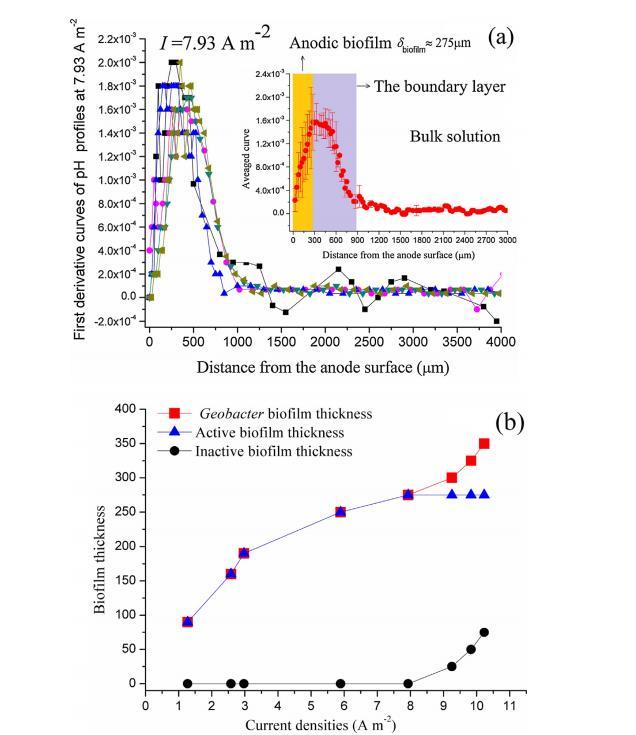 圖3.在7.93A m-2下pH對深度的一階導數圖,插圖顯示了平均曲線,誤差線表示標準偏差。(a);各種電流密度下的生物膜厚度及其活性部分和非活性部分(b)。
