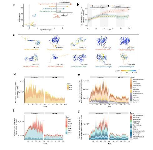 圖3、根際和塊狀土壤中AMG和相應(yīng)宿主微生物的剖面。a)與根際As-oxidizing微生物相關(guān)的病毒基因的富集分析。使用Wald檢驗(yàn)確定統(tǒng)計顯著性。每個圓圈代表一個基因,顏色表示它所屬的代謝途徑。右圖顯示了這些代謝途徑中富集基因的數(shù)量。b)根際AMGs途徑與塊狀土壤的富集比。c)與根際As-氧化微生物相關(guān)的富集AMG的蛋白質(zhì)結(jié)構(gòu)。pTM評分衡量整個蛋白質(zhì)結(jié)構(gòu)的準(zhǔn)確性。pLDDT在0-100范圍內(nèi)顯示為每原子置信度,其中值越高表示置信度越高。d)根際和塊狀土壤中的氧化性AMG豐度。e)根際和塊狀土壤中具有氧化AMG的屬水平宿主微生物的豐度和組成。f)P代謝AMG在根際和塊狀土壤中的豐度。g根際和塊狀土壤中P代謝AMG在屬水平上的宿主微生物的豐度和組成。