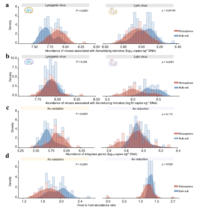 圖2、與根際和塊狀土壤中轉(zhuǎn)化As微生物相關(guān)的病毒的生活方式。參與As氧化(a)和As還原(b)、病毒整合酶基因(c)以及As氧化和還原的病毒與宿主豐度比(d)的溶原和裂解病毒豐度分布。a-c(右),d(左)使用雙側(cè)Welch t檢驗(yàn)(n=50)確定根際和塊狀土壤之間的統(tǒng)計顯著性。c(左),d(右)使用雙側(cè)學(xué)生t檢驗(yàn)(n=50)確定根際土壤和塊狀土壤之間的統(tǒng)計顯著性。