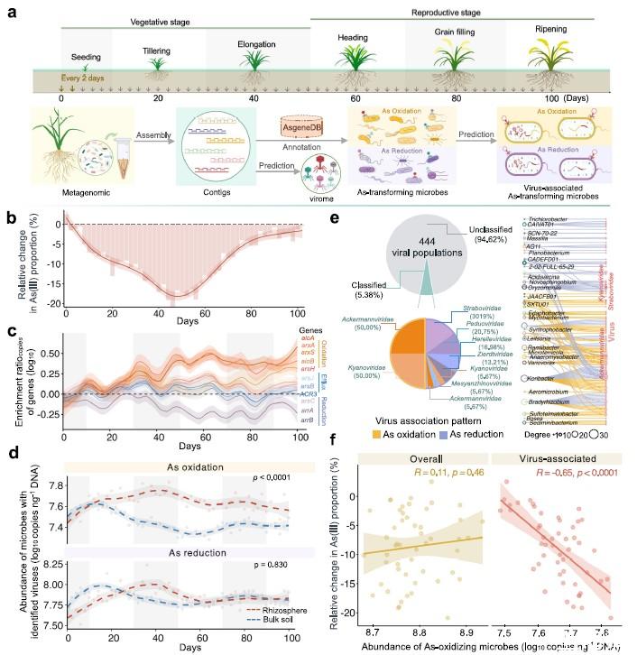 研究簡介:本研究主要對際環(huán)境中病毒如何通過溶原性(lysogeny)介導(dǎo)微生物代謝重編程,從而增強(qiáng)砷氧化的過程進(jìn)行了研究。砷是一種高毒性類金屬,廣泛存在于土壤中,對全球數(shù)億人構(gòu)成健康威脅。砷的氧化態(tài)在毒性、遷移性和生物可利用性方面存在顯著差異,As(V)的毒性較低且更難遷移。研究團(tuán)隊(duì)通過在100天的水稻生長季內(nèi),每隔兩天對水稻根際和大田土壤進(jìn)行時間序列采樣,收集了豐富的樣本數(shù)據(jù)。利用宏基因組測序技術(shù),他們分析了病毒和微生物的組成和功能,揭示了根際中砷氧化微生物與病毒之間的復(fù)雜相互作用。研究發(fā)現(xiàn),根際環(huán)境顯著促進(jìn)了病毒與砷氧化微生物之間的相互作用,尤其是溶原性病毒在增強(qiáng)砷氧化過程中發(fā)揮了關(guān)鍵作用。根際病毒不僅富集了與砷氧化和磷代謝相關(guān)的輔助代謝基因(AMGs),還介導(dǎo)了水平基因轉(zhuǎn)移(HGT),增強(qiáng)了微生物的砷氧化能力。這些發(fā)現(xiàn)表明,根際病毒通過攜帶和轉(zhuǎn)移關(guān)鍵基因,顯著提升了微生物的砷氧化效率。此外,通過構(gòu)建基因組規(guī)模代謝模型(GEMs)和體外實(shí)驗(yàn)驗(yàn)證,研究團(tuán)隊(duì)估計根際溶原性病毒對微生物砷氧化的貢獻(xiàn)可達(dá)25%。這一發(fā)現(xiàn)不僅拓展了我們對植物-微生物-病毒相互作用的理解,還為開發(fā)基于病毒的生物修復(fù)策略提供了科學(xué)依據(jù),有助于減輕砷污染對環(huán)境和人類健康的威脅。本研究揭示了根際病毒在砷生物地球化學(xué)循環(huán)中的重要作用,為可持續(xù)農(nóng)業(yè)中改善土壤健康提供了新的視角和潛在的解決方案。