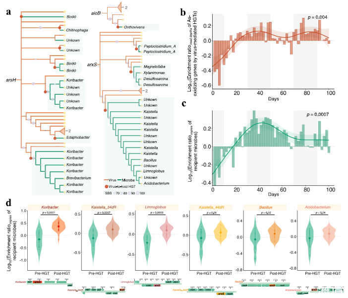 圖4、病毒介導(dǎo)的As-oxidizing基因在根際水平轉(zhuǎn)移的剖面圖。a)HGT從病毒到宿主的As-oxidizing基因的系統(tǒng)發(fā)育起源。As-oxidizing基因的表型相關(guān)性用顏色表示,并使用標(biāo)準(zhǔn)引導(dǎo)(SBS)評估統(tǒng)計支持(n=1000)。b)與塊狀土壤相比,病毒介導(dǎo)的HGT在根際氧化基因的富集率。c)與塊狀土壤相比,根際受體微生物的富集率拷貝。d)病毒介導(dǎo)的HGT對受體微生物富集率的影響。