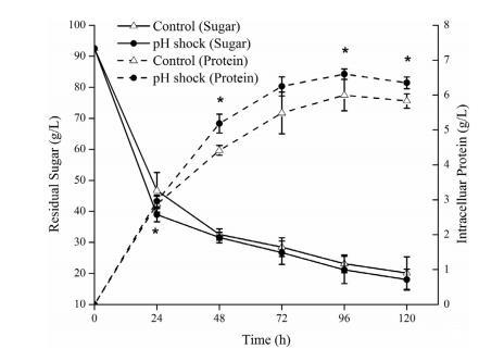糖的消耗反映了鏈霉菌的能量代謝。Val-A合成的碳源前體是磷酸戊糖途徑上的景天庚酮糖-7-磷酸(Degwert et al.,1987;Toyokuni et al.,1987)。pH沖擊組第一天的糖消耗速率[2.23 g/(L·h)]快于對照組[1.91 g/(L·h)],并且pH沖擊組的細胞代謝活性相對較高(圖2)。這主要是由于堿刺激使細胞加速利用碳水化合物產(chǎn)生酸以恢復(fù)pH。此外,發(fā)酵液中糖的消耗為細胞生長提供了能量,這與生物量的增加相一致。