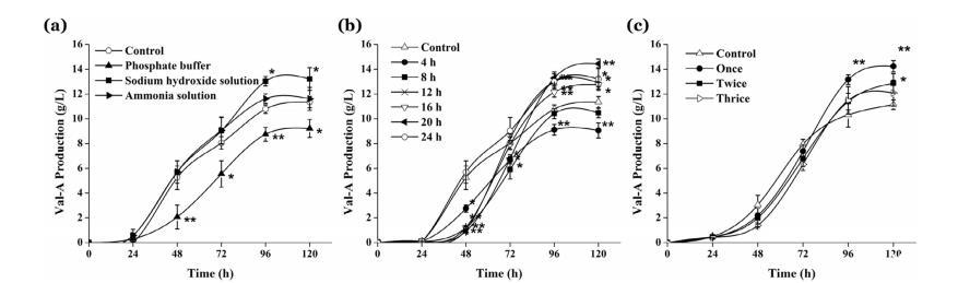 在初步篩選pH后,pH沖擊在8.0時效果最佳。分別向發(fā)酵液中加入三種常見的堿液。發(fā)現(xiàn)兩種有效的添加劑氫氧化鈉和氨水,而磷酸鹽緩沖液則具有相反的效果(圖1a)。這與一些文獻報道一致,這些文獻記載過量的無機磷酸鹽通常會抑制次級代謝產(chǎn)物的生產(chǎn)(Sola et al.,2003)。因此,所得結(jié)果表明pH沖擊有利于Val-A的生產(chǎn)。氫氧化鈉組的Val-A產(chǎn)量最高,因此選擇氫氧化鈉用于進一步研究。關(guān)于pH沖擊的合適時間點,選擇4 h-24 h內(nèi)的5個時間點作為最旺盛的時期(圖1b)。當堿性沖擊時間晚于24小時時,該處理對Val-A產(chǎn)量沒有顯著影響,圖中未顯示。很明顯,第20小時是pH沖擊的最佳時間。在4 h-12 h加入氫氧化鈉時,細胞仍處于生長早期,堿液的刺激在一定程度上阻礙了細胞的生長,因此pH沖擊沒有明顯效果,甚至降低了Val-A的產(chǎn)量。至于不同的處理次數(shù),發(fā)現(xiàn)多次pH沖擊的效果未達預(yù)期(圖1c)。在Val-A合成過程中,發(fā)酵液的pH會持續(xù)上升,這使得多次pH沖擊的效果不如單次pH沖擊顯著。總之,最佳條件是在第20小時向發(fā)酵液中加入氫氧化鈉溶液,而過多的無機磷酸鹽對Val-A生產(chǎn)有阻礙作用。