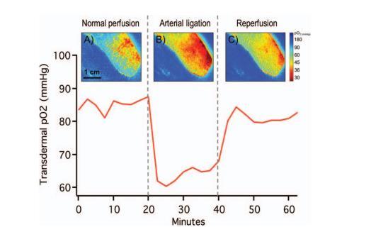 在左后肢上以每分鐘一張照片的速度拍攝平衡圖像20分鐘,然后通過夾住腎下降主動脈和腔靜脈束誘導雙側后肢缺血。隨后,以每分鐘1張照片的速度重復拍攝實驗性氧傳感繃帶的照片,持續20分鐘,同時進行連續氧監測,以評估組織在缺血條件不斷增加的情況下的氧張力。缺血20分鐘后,移除手術夾,再重復成像程序20分鐘。六只大鼠各進行了三次實驗。手術結束后,終止動物實驗。使用強度校準曲線生成每個時間點的組織pO2張力值。纏上繃帶后,繃帶氧張力會在大約20分鐘內與下面的組織達到平衡。平衡曲線由第一個20分鐘基線測量值擬合而成。主動脈結扎和再灌注期間經皮氧張力的偏差是通過比較測量的氧張力-時間軌跡和平衡曲線繪制的。使用近紅外組織血氧儀和克拉克電極進行連續記錄。