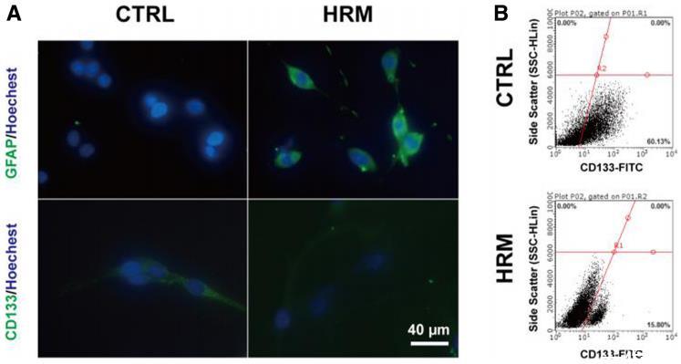 圖4氫處理誘導C6亞球分化。氫氣處理后,用免疫熒光染色法評估C6亞球中GFAP和CD133的表達水平(a)。氫氣處理后使用流式細胞儀測定CD133陽性細胞的數量(b)。GFAP:神經膠質纖維酸性蛋白;CTRL:對照組;HRM:富氫培養基