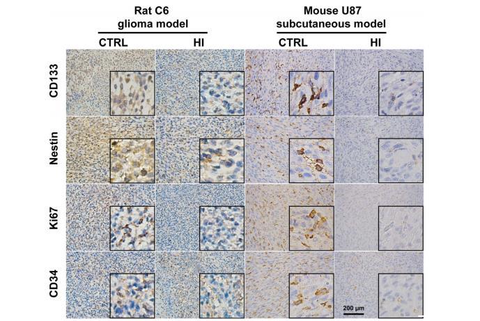 圖2:吸入氫氣后,生物標志物的表達發生了變化。在大鼠C6膠質瘤和小鼠U87皮下模型中,吸入氫氣都會降低CD133、Nestin、Ki67和CD34的表達。CTRL:對照組;HI:氫氣吸入組