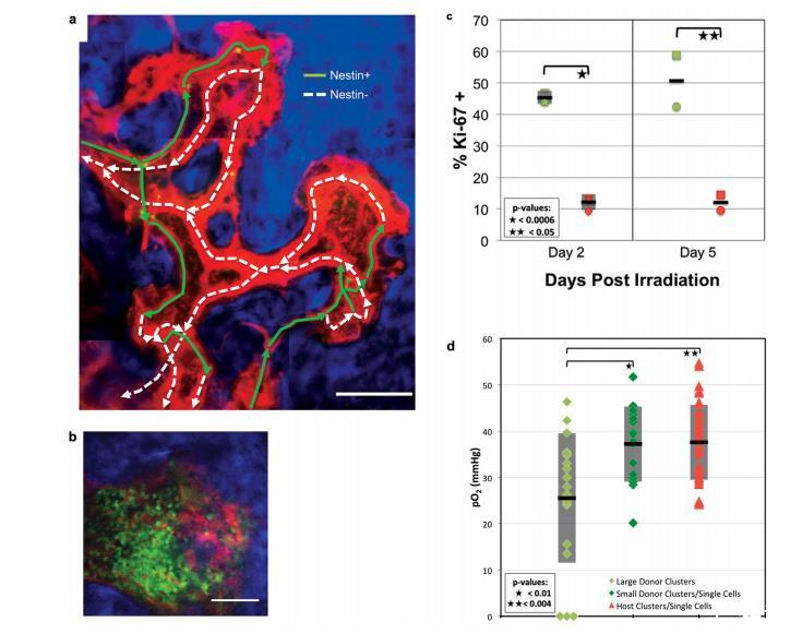 (a)nestin-GFP小鼠的血管連接圖顯示,nestin+血管位于竇道的上游并向竇道排水。表示血流方向的箭頭是通過視頻速率成像跟蹤標(biāo)記的RBC的移動確定的,并疊加在BM血管的最大強(qiáng)度投影圖上(紅色=血管染料,綠色=nestinGFP/RBC,藍(lán)色=SHG骨信號)。綠色實線表示血管與鄰近的nestin+細(xì)胞,白色虛線表示nestin-血管。縮放條~100μm。(b)一個通用DsRed受體的骨髓在移植了來自通用GFP供體的2,500萬個骨髓細(xì)胞5天后的體內(nèi)圖像。紅色=DsRed,綠色=GFP,藍(lán)色=骨的SHG。縮放條~100μm。(c)移植后第2天(n=3只小鼠)和第5天(n=2只小鼠),通過FACS對綠色(供體)和紅色(宿主)骨髓細(xì)胞進(jìn)行Ki-67染色。每個符號代表不同的小鼠。刻度線(第2天)為平均值的±標(biāo)準(zhǔn)偏差。(d)與小的供體細(xì)胞群/單細(xì)胞(4只小鼠,n=16個位置)和宿主細(xì)胞群/單細(xì)胞(5只小鼠,n=40個位置)相比,大的供體細(xì)胞群(4只小鼠,n=19個位置)區(qū)域的體內(nèi)pO2值。圖中顯示了每組數(shù)據(jù)的平均值(黑線)和±標(biāo)準(zhǔn)偏差(陰影框)。
