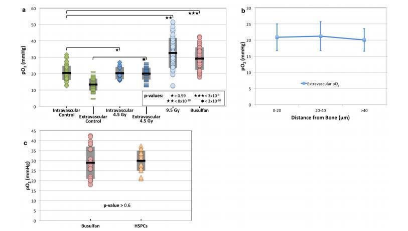 (a)亞致死(4.5Gy,n=5只小鼠的13個血管和29個血管外位置)或致死(9.5Gy,n=2只小鼠的40個位置)伽馬輻照兩天后,或丁胺(35mg/kg,n=6只小鼠的40個位置)調(diào)理兩天后的BM pO2。圖1d中未經(jīng)處理的對照組pO2與之比較。(b)血管外pO2測量值與4.5Gy照射2天后測量位置到骨表面距離的函數(shù)關(guān)系圖(n=44個位置,來自4只小鼠)。(c)HSPC歸巢部位的pO2與丁胺苯磺吡啶治療受體的整體BM pO2的比較(n=17個HSPC,來自6只小鼠)。未觀察到有統(tǒng)計學(xué)意義的差異。在(a)和(c)中,顯示了每組數(shù)據(jù)的平均值(黑線)和±標(biāo)準(zhǔn)偏差(陰影框)。