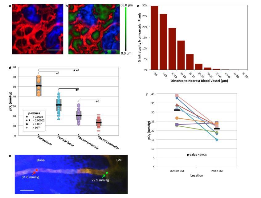 使用軸向疊層,按照之前的方法計算出每個pO2測量值到最近的骨表面(骨膜)的距離。簡言之,利用勾股定理確定三維空間中到骨膜的最短距離。使用羅丹明B右旋糖酐信號測量血管直徑。該測量僅在x-y平面上進(jìn)行,是血管腔的直徑。距離和血管直徑的測量均在ImageJ v.1.47p中進(jìn)行。為便于顯示,調(diào)整了圖1a-b、1e、4a-b、擴(kuò)展數(shù)據(jù)圖4、6和7以及擴(kuò)展數(shù)據(jù)視頻1的亮度和對比度。所有圖像分析均在原始圖像上進(jìn)行。在圖1a中,顯示的最大強(qiáng)度投影圖像僅包括藍(lán)色通道中約23μm的深度。我們沒有包括藍(lán)色通道的整個厚度,因為在最淺的深度,骨SHG信號覆蓋了圖像的大部分。