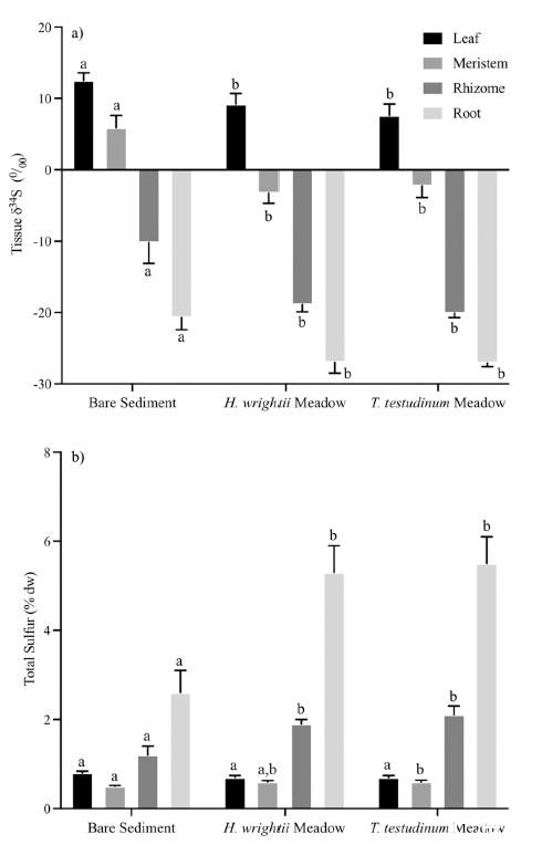 圖1、(a)三種生境(裸沙單株、H.wrightii草甸、T.testudinum草甸)中海龜草葉片、頂端分生組織、根狀莖及根的穩(wěn)定硫同位素值(δ3?S)。不同字母表示生境間差異顯著(季節(jié)平均值±標(biāo)準(zhǔn)誤)。(b)各部位總硫含量(TS,干重百分比)。