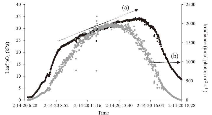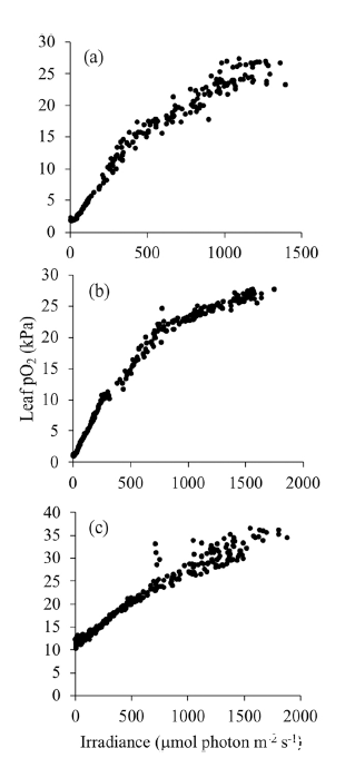 圖3、葉片內(nèi)pO?隨光照變化的二相動態(tài)(示例)。葉片內(nèi)pO?(黑色)與光合有效輻射(灰色)隨時間變化。(a)2019-09-11;(b)2020-02-14;(c)2020-05-07。顯示日出后快速上升至28–36 kPa,之后隨光強增加緩慢上升。