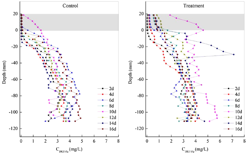 圖4、沉積物-上覆水剖面中可溶性Fe的變化。Fe的分布模式與P明顯不同,處理組和對照組均表現(xiàn)為隨沉積物深度增加而濃度升高的趨勢,最高值出現(xiàn)在培養(yǎng)第10天。這種一致性表明無論是否添加藻類,沉積物都是上覆水Fe的主要來源。處理組Fe濃度整體高于對照組,證實藻類分解創(chuàng)造的還原環(huán)境促進了沉積物中鐵氧化物的溶解釋放。