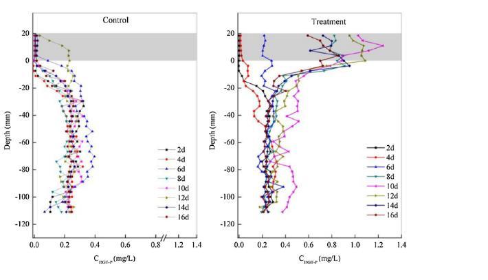 圖3、DGT技術(shù)測量的沉積物-上覆水剖面中可溶性磷的變化。ZrO-Chelex DGT測量結(jié)果顯示,處理組(右)可溶性P在SWI附近形成明顯濃度峰,最高值出現(xiàn)在第10天(0.87±0.26 mg/L),且濃度梯度指向沉積物和上覆水兩個方向。對照組(左)P濃度隨深度增加而緩慢升高,表明其釋放主要來自沉積物鐵氧化物的還原溶解。灰色陰影區(qū)標示上覆水區(qū)域(SWI上方20mm)。