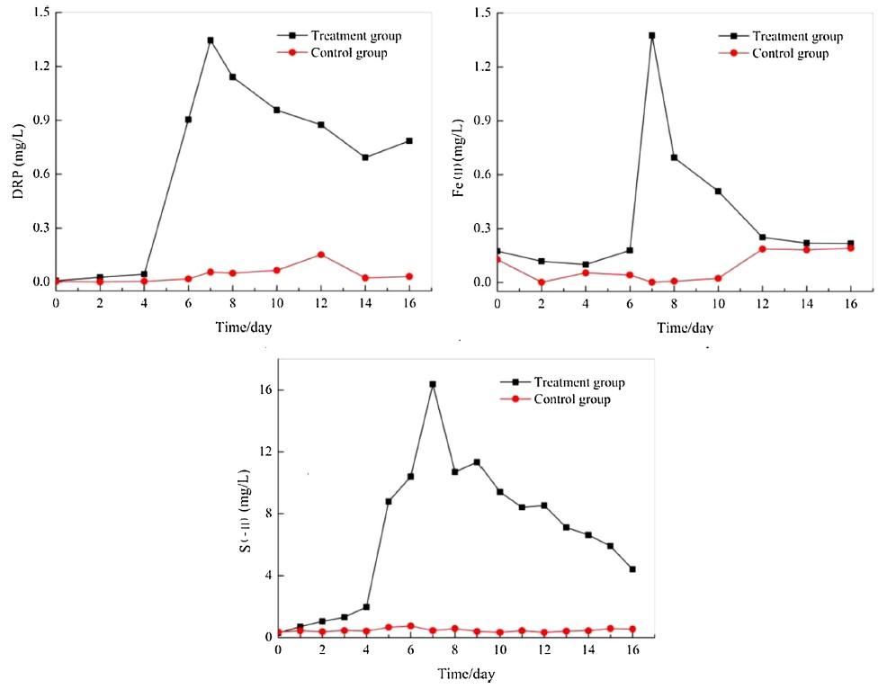 圖1、水柱中SRP、可溶性Fe(II)和S(-II)在培養(yǎng)期間的變化。本圖展示了添加藻類處理組和對照組在水柱中可溶性活性磷(SRP)、亞鐵離子(Fe(II))和硫化物(S(-II))濃度隨時間的變化規(guī)律。處理組三種物質(zhì)均呈現(xiàn)先升高后降低的單峰變化趨勢,第7天達到峰值(SRP 1.36 mg/L,F(xiàn)e(II)0.69 mg/L,S(-II)16.37 mg/L)。對照組則保持相對穩(wěn)定的低濃度水平。這種差異直觀反映了藻類分解對水化學(xué)環(huán)境的顯著影響。