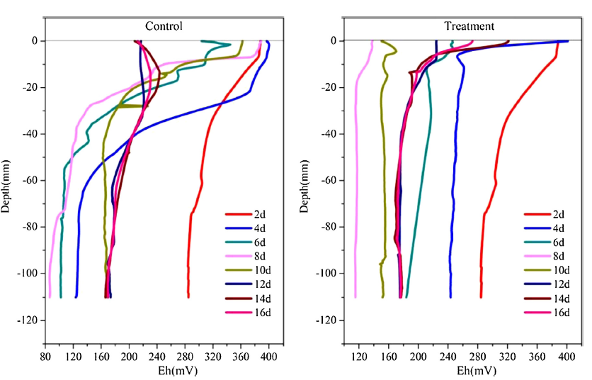 圖2、培養(yǎng)期間沉積物剖面Eh值的變化。通過Unisense微電極系統(tǒng)測量的沉積物氧化還原電位(Eh)剖面顯示,處理組(右)在前8天Eh值持續(xù)下降,最低點出現(xiàn)在約-20mm深度處,表明藻類分解創(chuàng)造了強還原環(huán)境。對照組(左)Eh值變化相對平緩,后期上層沉積物出現(xiàn)Eh值下降,反映有機質(zhì)的自然礦化過程。兩組差異證實藻類添加顯著加速了沉積物的還原進程。