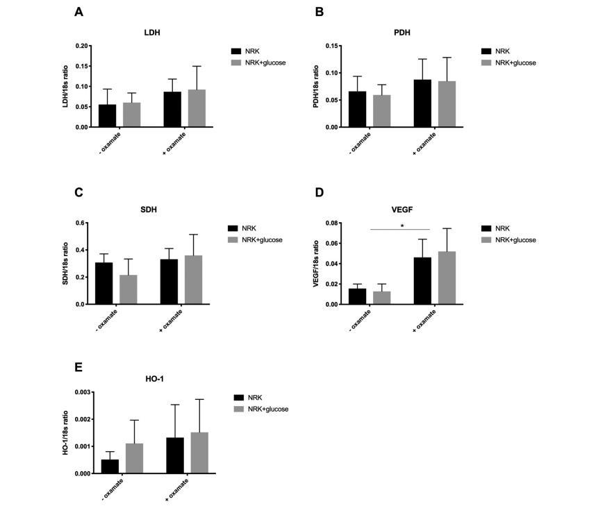 為了了解代謝和呼吸的變化是如何發(fā)生的,我們檢測了關(guān)鍵酶的mRNA表達(dá)水平,發(fā)現(xiàn)LDH、丙酮酸脫氫酶(PDH)和琥珀酸脫氫酶(SDH)的表達(dá)幾乎不受高血糖培養(yǎng)條件的影響。另一方面,草氨酸處理會增加正常和高血糖NRK-52E細(xì)胞培養(yǎng)物中所有基因的表達(dá),但并不顯著(圖4A-C)。在正常和高血糖的NRK-52E細(xì)胞中,草酸鹽處理和未處理的NRK-52E細(xì)胞中血管內(nèi)皮生長因子的表達(dá)均有明顯變化(p=0.0004)(圖4D),血紅素氧合酶-1(HO-1)標(biāo)記物的表達(dá)也有同樣的趨勢(圖4E)。