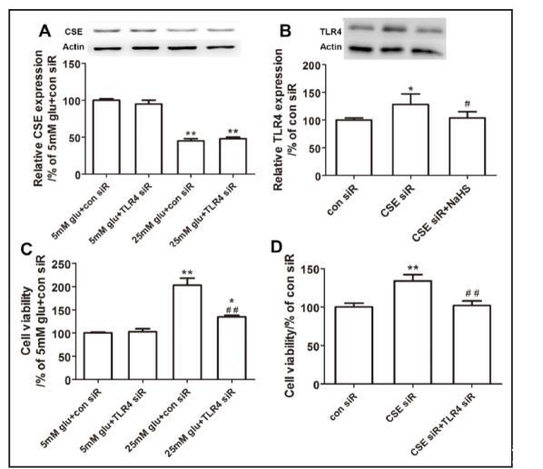 (A) TLR4抑制未改變高葡萄糖處理的小鼠系膜細胞中CSE的表達(數值為均值±標準誤;P < 0.01 vs. 5 mM葡萄糖+對照siRNA;n = 4)。