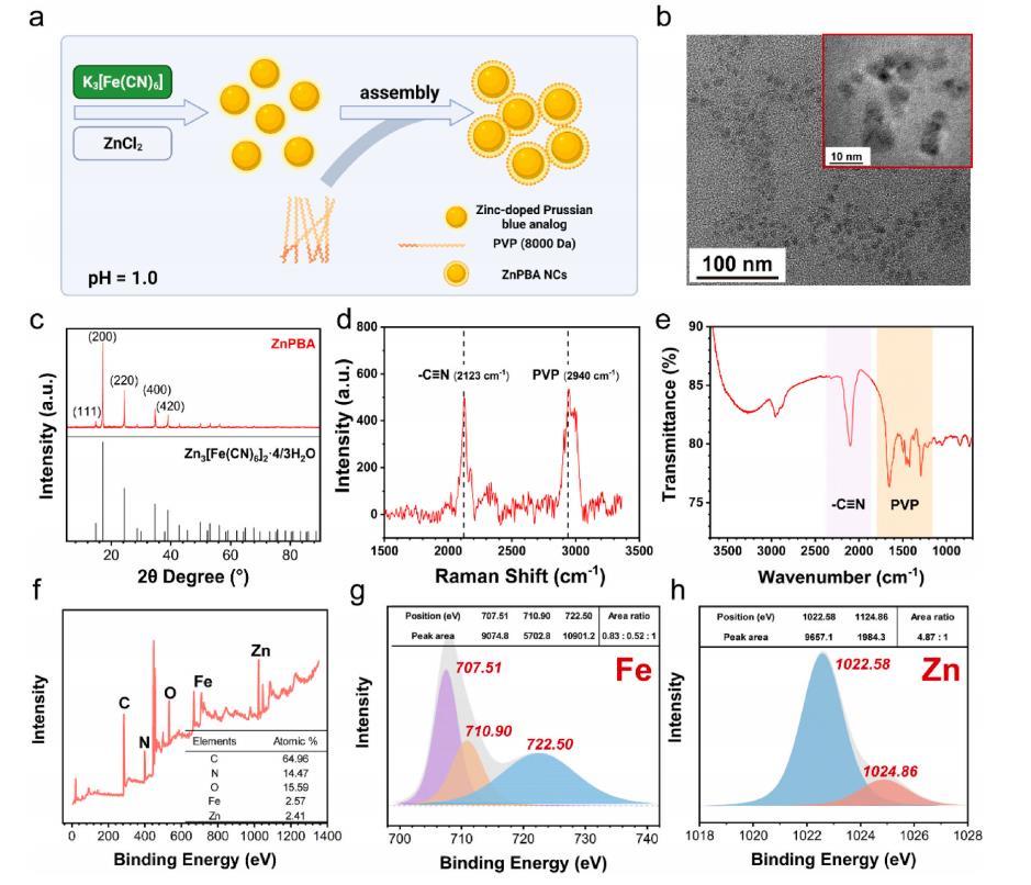 從傅立葉變換紅外光譜來(lái)看,1279cm處的峰值可歸因于C-N振蕩,而1660cm處的強(qiáng)峰值則表明吡咯烷酮環(huán)存在C-O伸縮振動(dòng)吸收。此外,在2103cm處可以觀察到強(qiáng)烈的紅外吸收,這是C-N鍵的特征(圖2e)。X射線光電子能譜(XPS)進(jìn)一步研究了ZnPBA NCs的化學(xué)成分和結(jié)合結(jié)構(gòu)。根據(jù)ZnPBA NCs的掃描光譜(圖2f),可以檢測(cè)到包括Zn、Fe、K、C、N和O在內(nèi)的主要元素,并對(duì)其原子濃度進(jìn)行了半定量測(cè)定,如圖2f插入的表格所示。為了進(jìn)一步研究鐵和鋅的價(jià)態(tài),還記錄了這些元素的高分辨率光譜。位于710.9eV和722.5eV的峰可以分配給Fe2p3/2和Fe2p1/2物種。在707.5eV的峰值顯示了Fe2+的存在,而在1022.6eV和1024.9eV的峰值對(duì)應(yīng)于二價(jià)鋅陽(yáng)離子(圖2g-h),表明鋅離子為+2價(jià),而鐵離子為+2/+3混合價(jià)。上述光譜事實(shí)進(jìn)一步證實(shí)了氯化鋅、鐵氰化鉀和PVP聚合物成功地組裝到了ZnPBA NCs上,形成了Zn3[Fe(CN)6]2的一般組成。