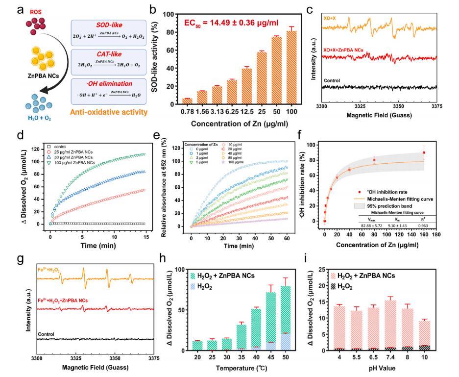 計(jì)算得出的-OH抑制率在ZnPBA NCs濃度為20μg/ml時(shí)達(dá)到57.19±3.69%,在濃度升至160μg/ml時(shí)進(jìn)一步提高到90.08±9.32%(圖3f)。接下來(lái),我們利用EPR光譜鑒定了DMPO捕集劑存在時(shí)的-OH清除性能。在弱酸性環(huán)境下,可以觀察到FeSO4(20μM)和H2O2(2.5mM)之間的Fenton反應(yīng)產(chǎn)生的-OH光譜信號(hào)(振幅為1:2:2:1)。加入ZnPBA NCs(100μg/ml)可有效減弱-OH的光譜信號(hào),驗(yàn)證了ZnPBA NCs強(qiáng)大的-OH清除能力(圖3g)。通過(guò)檢測(cè)ZnPBA NCs與H2O2反應(yīng)過(guò)程中的溶解氧濃度,ZnPBA NCs在不同溫度(20?C至50?C)和pH值(4.0至10.0)條件下均表現(xiàn)出較高的CAT模擬活性。溫度的升高在很大程度上加速了H2O2(含或不含ZnPBA NCs)的分解(圖3h和i)。上述結(jié)果證明,ZnPBA NCs在溫度、pH值和底物濃度范圍較寬的條件下對(duì)ROS具有穩(wěn)定高效的抗氧化催化活性。