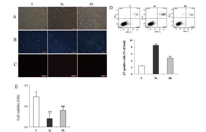 圖5:6Gy輻射24小時后,氫氣保護IEC-6細胞免受輻射誘導的損傷。(A)6Gy輻射24小時后IEC-6細胞的相位對比圖像。(B)輻射6Gy后24小時死亡細胞Hoechst染色的代表性顯微照片。(C)輻射6Gy后24小時,壞死細胞PI染色的代表性顯微照片。(D)用附件素V-PI染色細胞,并用流式細胞術分析6Gy劑量輻射后24小時的細胞,凋亡細胞的直方圖以占總細胞的百分比表示。(E)細胞存活率直方圖以各組的OD值。