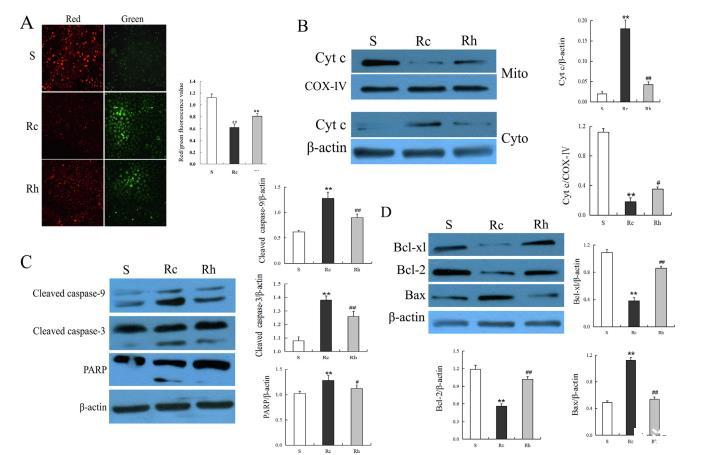 還通過熒光顯微鏡和流式細胞儀檢測線粒體膜電位(MMP),探討了氫氣對輻射誘導的細胞凋亡的保護作用。與S組相比,受到輻射刺激的細胞顯示出更高水平的綠色熒光強度和更低水平的紅色熒光強度,這表明輻射照射后MMP明顯降低。然而,用Hm處理明顯阻止了MMP的下降(圖6A)。