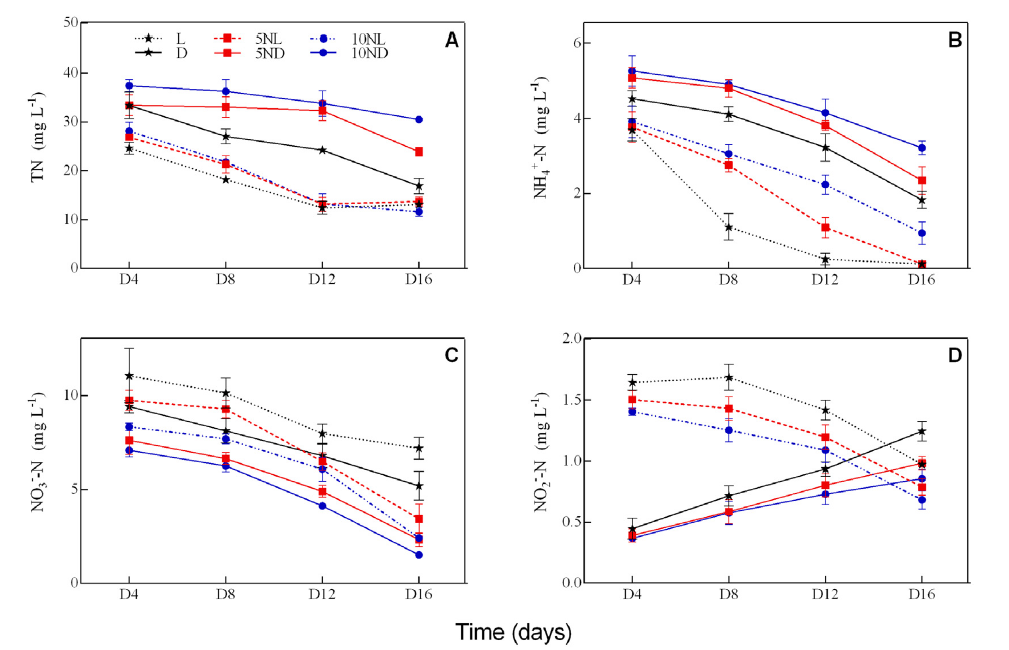 圖4、上覆水中氮形態(tài)的變化。黑暗條件下TN的濃度更高,DCD劑量增加會(huì)抑制硝化,導(dǎo)致NH??積累。光照處理中NO??-N的濃度更低,因生物膜促進(jìn)了反硝化作用(NO??→N?)