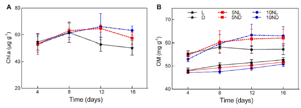 圖3、附生生物膜的葉綠素a(Chl.a)和有機(jī)質(zhì)(OM)含量。圖A(Chl.a):光照條件下藻類生物量先增后降,高劑量DCD(10NL)處理中Chl.a最高,表明DCD可能通過抑制競爭性細(xì)菌間接促進(jìn)藻類生長。圖B(OM):光照處理的OM含量始終高于黑暗條件,且DCD添加進(jìn)一步提高了OM,可能與生物膜代謝產(chǎn)物積累相關(guān)。
