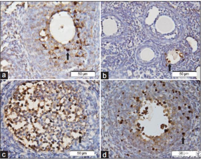 圖3、卵巢凋亡顆粒細胞的形態(tài)學分析。(a)對照組、(b)富氫水組、(c)模型組和(d)模型-富氫水組中的TUNEL陽性顆粒細胞。深棕色點(黑色箭頭)指示凋亡顆粒細胞。比例尺=50μm。TUNEL:末端脫氧核苷酸轉(zhuǎn)移酶dUTP缺口末端標記。
