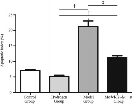 圖2、富氫水對顆粒細胞凋亡指數(shù)的影響。通過TUNEL法評估凋亡。數(shù)據(jù)代表均值±標準誤。與對照組相比*P<0.001;?P<0.05;?P<0.001。TUNEL:末端脫氧核苷酸轉(zhuǎn)移酶dUTP缺口末端標記。