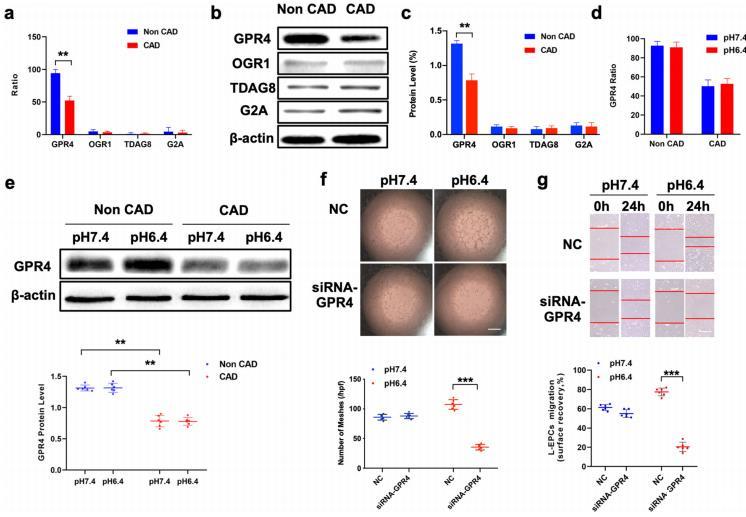 圖3:非CAD和CAD患者EPCs中質子傳感GPCR家族的表達和血管生成能力。a使用dPCR測定EPCs中質子感應GPCR家族表達的mRNA水平。b,c GPCR家族蛋白質水平的代表性照片和定量分析。d dPCR用于測定不同pH環境中GPR4的mRNA水平。e不同pH值環境下GPR4表達的定量分析和代表性照片,然后用GPR4抗體進行免疫印跡。f,g用siRNA-NC或siRNA-GPR4轉染EPCs,拍攝Matrigel管樣形成試驗(比例尺=40μm)和劃痕試驗(比例尺=20μm)的代表性照片并進行定量分析。