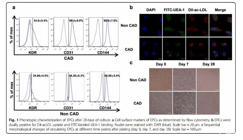 共有20人參加了研究,其中CAD組和健康組各有10人。兩組基線特征無明顯差異。晚期EPC由培養28天的PBMNCs獲得(圖1c),與之前的研究類似。培養28天后,通過流式細胞術分析培養的EPCs的標記蛋白,包括KDR、CD31和CD144(圖1a),EPCs的DiI-acLDL攝取和FITC標記的凝集素-1結合均為陽性(圖1b)。