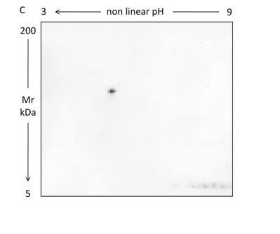 圖7外泌體蛋白質二維電泳圖譜。A,外泌體總蛋白的代表性銀染色;B,生物素化的外泌體表面蛋白;C,ATP5B的Western印跡檢測。用抗ATP5B檢測FoF1-ATP合酶beta亞基后觀察到的斑點與觀察生物素化外泌體蛋白后觀察到的一些斑點重疊,表明這些斑點代表了外泌體表面特異表達的一種蛋白。