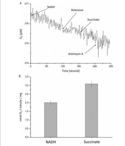 這些意想不到的發現表明,尿液外泌體特別富含有氧代謝蛋白質,因此我們開始評估這些蛋白質在氧化磷酸化(OXPHOS)過程中是否活躍。為了評估這一點,我們評估了尿液外泌體的耗氧量和ATP合成。實驗是在沒有去污劑的情況下進行的,以檢測表面的OXPHOS。圖6A顯示了尿液外泌體呼吸作用圖,在加入NADH誘導由復合物I、III和IV組成的呼吸途徑,或加入琥珀酸激活由復合物II、III和IV組成的呼吸途徑之后,尿液外泌體的呼吸作用發生了變化。之所以選擇NADH作為呼吸底物,是因為它有助于區分線粒體呼吸和線粒體外呼吸(我們之前已經證明了這一點),因為它對作為呼吸底物的離體線粒體無滲透性。圖6A顯示,尿液外泌體消耗氧氣的方式分別受到復合體I和III抑制劑魚藤酮和抗霉素A的抑制。有趣的是,存在琥珀酸時的呼吸速率高于存在NADH時的呼吸速率,這也如圖6B所示。這證實了耗氧量不是由于線粒體污染造成的,因為在這些細胞器中,復合體I、III和IV的途徑通常比復合體II、III和IV組成的途徑更有效。為了評估尿液外泌體中的耗氧量是否最終轉化為ATP合成,我們在NADH存在下檢測了ATP合成活性。ATP合成在反應的前2分鐘呈線性(數據未顯示)。P/O比約為2.4±0.3,表明氧消耗與ATP合成相關聯。