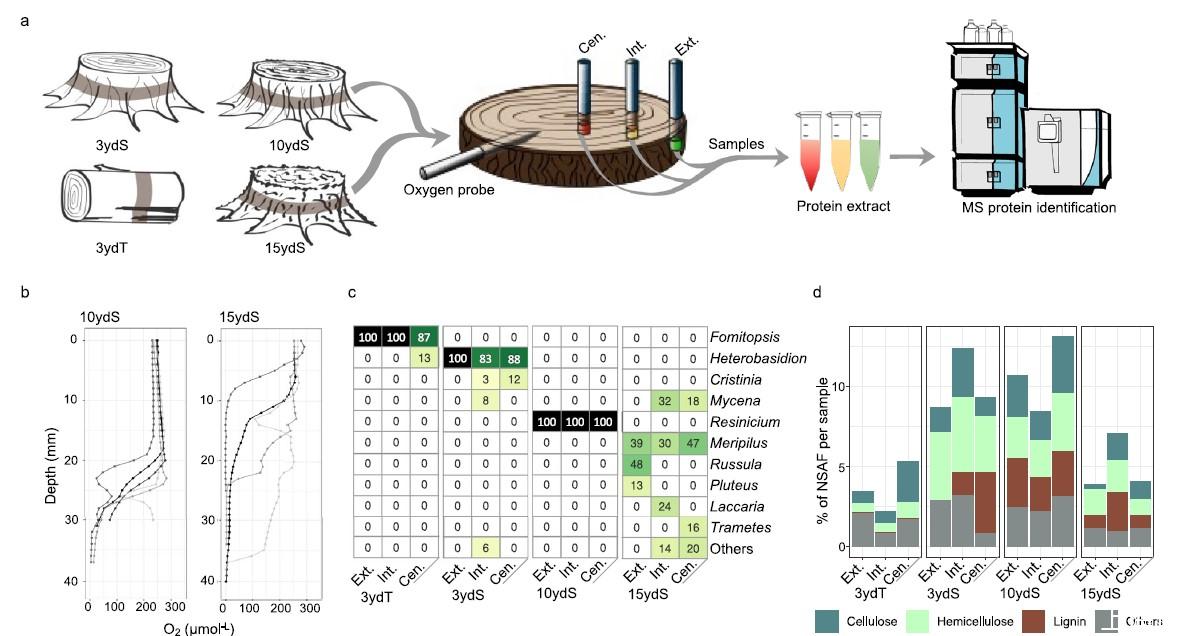 圖1、對(duì)不同木材深度處的真菌及其酶的代謝組學(xué)鑒定。a)實(shí)驗(yàn)設(shè)計(jì)總結(jié)。所有蛋白質(zhì)提取均與樣本平行進(jìn)行,每個(gè)樣本有三個(gè)獨(dú)立重復(fù)。圖片使用Inkscape繪制。b)不同腐爛年齡的Picea abies木材中的O?濃度。測(cè)量在40毫米深度之前停止,無(wú)法進(jìn)一步穿透木材。3年腐爛的木材不夠松軟,無(wú)法讓氧氣探測(cè)器穿透。c)從樣本中提取的真菌蛋白的分類歸屬。d)樣本中分泌的碳水化合物活性酶(CAZymes)的普遍性。