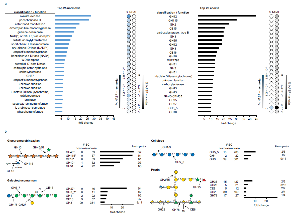 圖4、常氧和缺氧條件下pinicola Fomitopsis的蛋白質(zhì)組學(xué)分析。a)在有氧(藍(lán)色)和缺氧(黑色)條件下差異產(chǎn)生的真菌蛋白,按倍數(shù)變化排序,并顯示在相應(yīng)條件下的相對(duì)豐度(%NSAF)。NSAF:歸一化光譜豐度因子,GH:糖苷水解酶,DUF:未知功能域。b)在缺氧條件下差異分泌的CAZyme家族及其在纖維素、半纖維素和果膠中的目標(biāo)鍵。