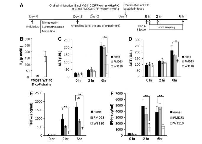本研究利用刀豆蛋白A誘導的急性肝炎小鼠模型,探討了(1)腸道定植菌釋放的H?量以及(2)腸道細菌釋放的H?對肝臟誘導的炎癥的影響。