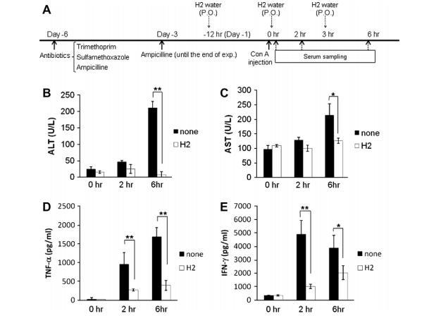 實驗方案A(ExperimentalProtocol-A):(1)小鼠自由飲用含有抗生素混合物(磺胺甲惡唑,8mg/ml和甲氧芐啶,1.6mg/ml)的水或對照無抗生素水,持續3天。(2)隨后兩天,兩組動物均自由飲用無抗生素水進行休養。(3)向兩組小鼠靜脈注射ConA(Sigma,St.Louis,MO,15mg/kg;生理鹽水溶液),并在注射后0、2和10小時監測血清中的ALT和AST水平。