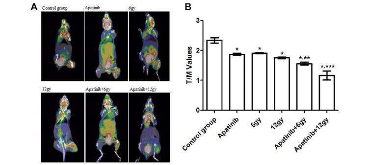 圖2顯微18F-氟脫氧葡萄糖(FDG)正電子發射斷層掃描/計算機斷層掃描(PET/CT)成像。A、小鼠接受不同治療方案一天后的代表性18F-FDGPET掃描圖。B、與不同治療方案相關的T/M(腫瘤最大SUV與對側脊柱旁肌肉最大SUV之比)。與對照組相比,*P<0.05。與阿帕替尼組(6 Gy)相比,***P<0.05。與阿帕替尼組(12 Gy)相比,***P<0.05。
