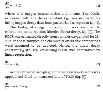 生物耗氧量假定表現出零階反應動力學(線性衰減,方程(2))。BOCR直接從氧化26-28小時的樣品中估算。在這些樣品中,假設化學可氧化的化合物已被消耗。因此,通過線性回歸確定了表示BOCR的線性衰減常數k?b(方程(2))。dC/dt=-k?(2)