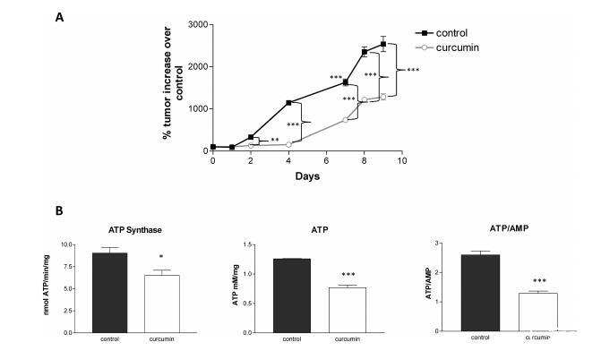 我們研究了在體內是否可以觀察到的所有四種細胞系對ATP合酶活性的抑制。我們在免疫缺陷小鼠皮下注射B16小鼠黑色素瘤細胞。當可觸及腫瘤(腫瘤直徑約2 mm)時,每隔一天向尾靜脈注射溶解的姜黃素(30 mg/kg)或單獨的姜黃素,連續10天,用卡尺測量腫瘤體積。姜黃素處理小鼠的腫瘤生長明顯低于對照處理小鼠(圖2A)。實驗結束時,切除腫瘤,制備線粒體膜組分,分析ATP合成及ATP和AMP含量。與對照組小鼠相比,姜黃素處理動物腫瘤中ATP合酶活性、ATP濃度和ATP/AMP比值顯著降低(圖2B),表明姜黃素在體內也能抑制ATP合酶。