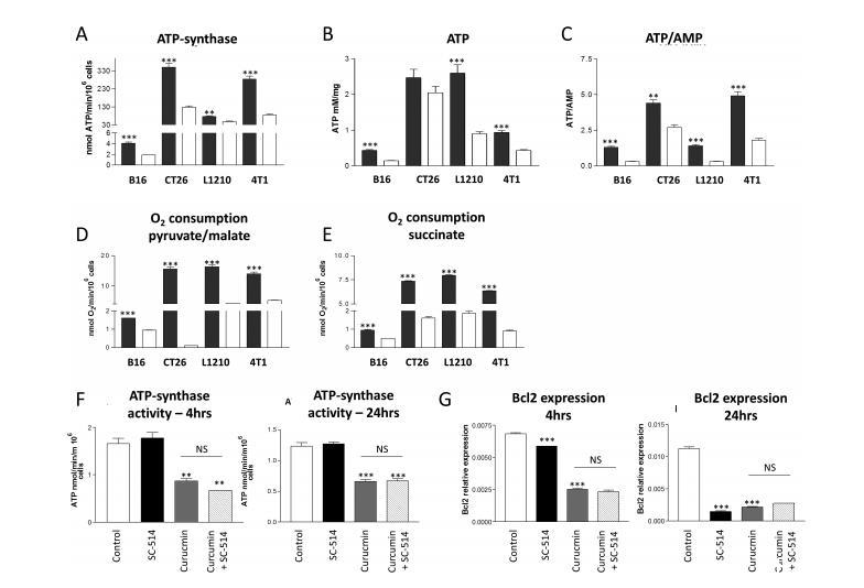 我們還測試了姜黃素對ATP合成的影響是否可以通過抑制NFκB來模擬。為此,我們使用了IkKβ特異性競爭抑制劑SC-514,因為有報道稱姜黃素可作用于該激酶。圖1F顯示,聯合添加SC-514和姜黃素4小時和24小時后,SC-514對B16細胞的ATP合成沒有影響。與之前觀察到的一樣,與姜黃素同時處理的B16細胞ATP合成減少(圖1F)。與單用姜黃素處理的細胞相比,SC-514與姜黃素的組合沒有產生任何疊加效應(圖1F)。不過,姜黃素和SC-514都能顯著抑制Bcl2的表達,Bcl2是一種抗凋亡基因,其轉錄受NFκB控制,但兩者的動力學過程顯然不同(圖1G)。姜黃素和SC-514的組合沒有顯示出任何相加效應。這些數據表明,姜黃素對NFκB和ATP合酶都有抑制作用,但對后者的活性并不取決于對前者的活性。