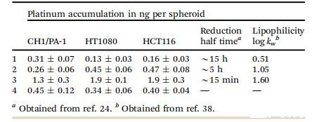 由于奧沙利鉑作為鉑(II)參比化合物,在三維實驗中的細胞毒性與二維實驗中的細胞毒性相比,IC50值增加了10倍(表1),因此我們假設,觀察到的鉑(IV)原藥細胞毒性活性的增加可能反映了它們被還原激活。為了支持這一觀點,我們選擇了化合物1(還原率和親脂性最低)和化合物2(還原率和親脂性居中),它們是在所有研究細胞系的缺氧球形體中按活化順序排列的表現最好的化合物,因此我們選擇它們在非缺氧球形體、缺氧單層培養以及缺氧異種移植中進行進一步研究。