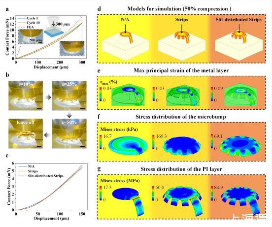 圖1.3D軟凸神經(jīng)微電極SMBE概述a)體內(nèi)常見但容易被忽視的由外向內(nèi)和由內(nèi)向外壓力引起的電極-組織相互作用;b)SMBE電極點在外界壓力下的自適應(yīng)變形示意圖;c)爆炸視圖;d)二維和三維狀態(tài)下帶有爪形微結(jié)構(gòu)的SMBE電極點照片;e)具有4個位點的SMBE電極陣列;f)超深度顯微鏡下SMBE電極點高度測量;g)微凸起中心帶誤差帶(n=10)的高度曲線。