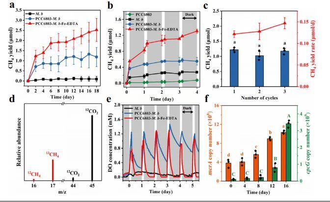 圖2、光照-黑暗周期中的光驅(qū)動甲烷生成。a)PCC6803-M.b-Fe-EDTA和對照組的甲烷產(chǎn)量。b)前四天的甲烷產(chǎn)量典型時間變化。c)三個連續(xù)18天周期中的甲烷產(chǎn)量和產(chǎn)率。d)使用13C標(biāo)記的NaHCO3作為唯一碳源的氣體質(zhì)量譜分析。e)溶解氧(DO)濃度的周期性變化。f)mcrA和cpcG基因拷貝數(shù)的評估。在b和e中,灰色區(qū)域表示光驅(qū)動甲烷生成中的黑暗期,光-暗周期為4小時-20小時。數(shù)據(jù)以平均值±標(biāo)準(zhǔn)差表示,來自n=3次獨(dú)立實(shí)驗(yàn)。統(tǒng)計(jì)分析采用配對雙尾t檢驗(yàn),不同字母表示不同組之間具有統(tǒng)計(jì)學(xué)顯著差異(P<0.05)。所有P值已在源數(shù)據(jù)中提供。源數(shù)據(jù)作為源數(shù)據(jù)文件提供。